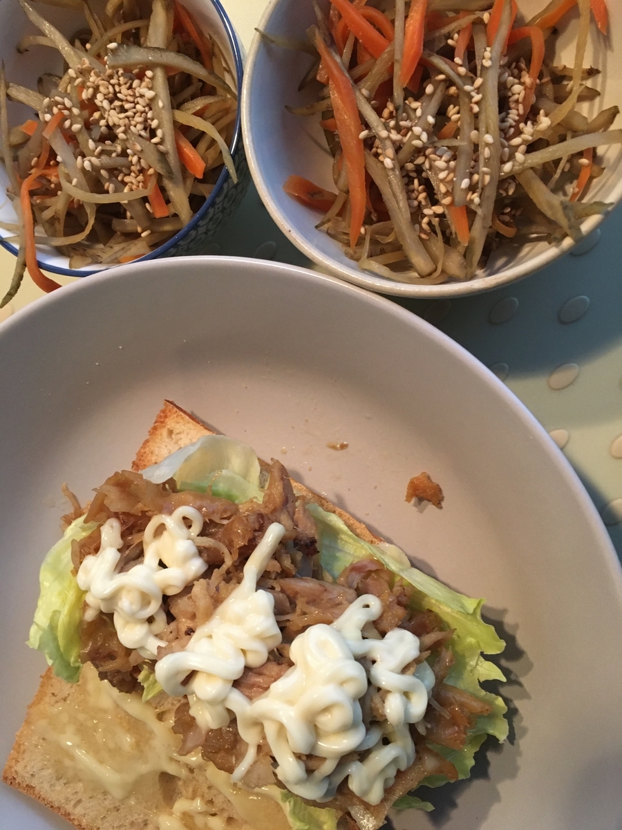 チキン照り焼きバゲットサンド、金平ごぼう