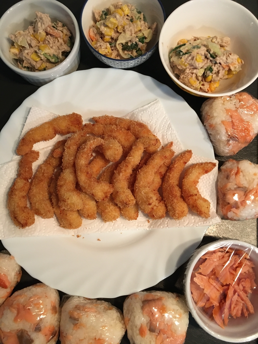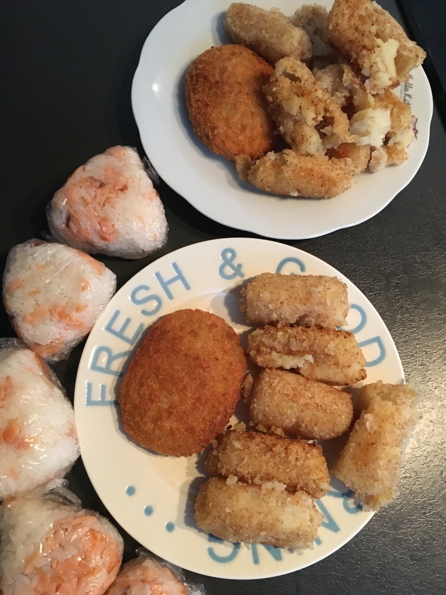 夜:サーモンおにぎり、かぼちゃコロッケ、爆発ポテトコロッケ