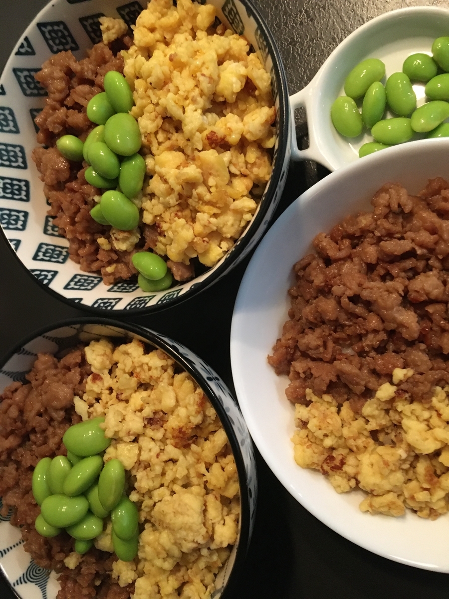 3色丼(鶏そぼろ、玉子そぼろ、枝豆)