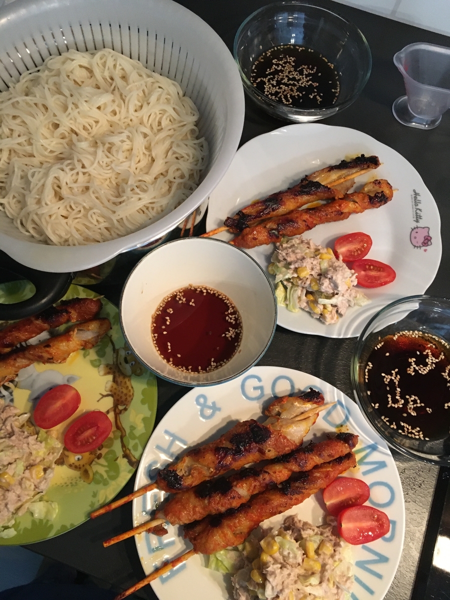 夜:冷やしそうめん、ベーコン串巻き、ツナサラダ、トマト