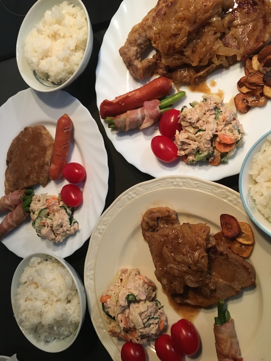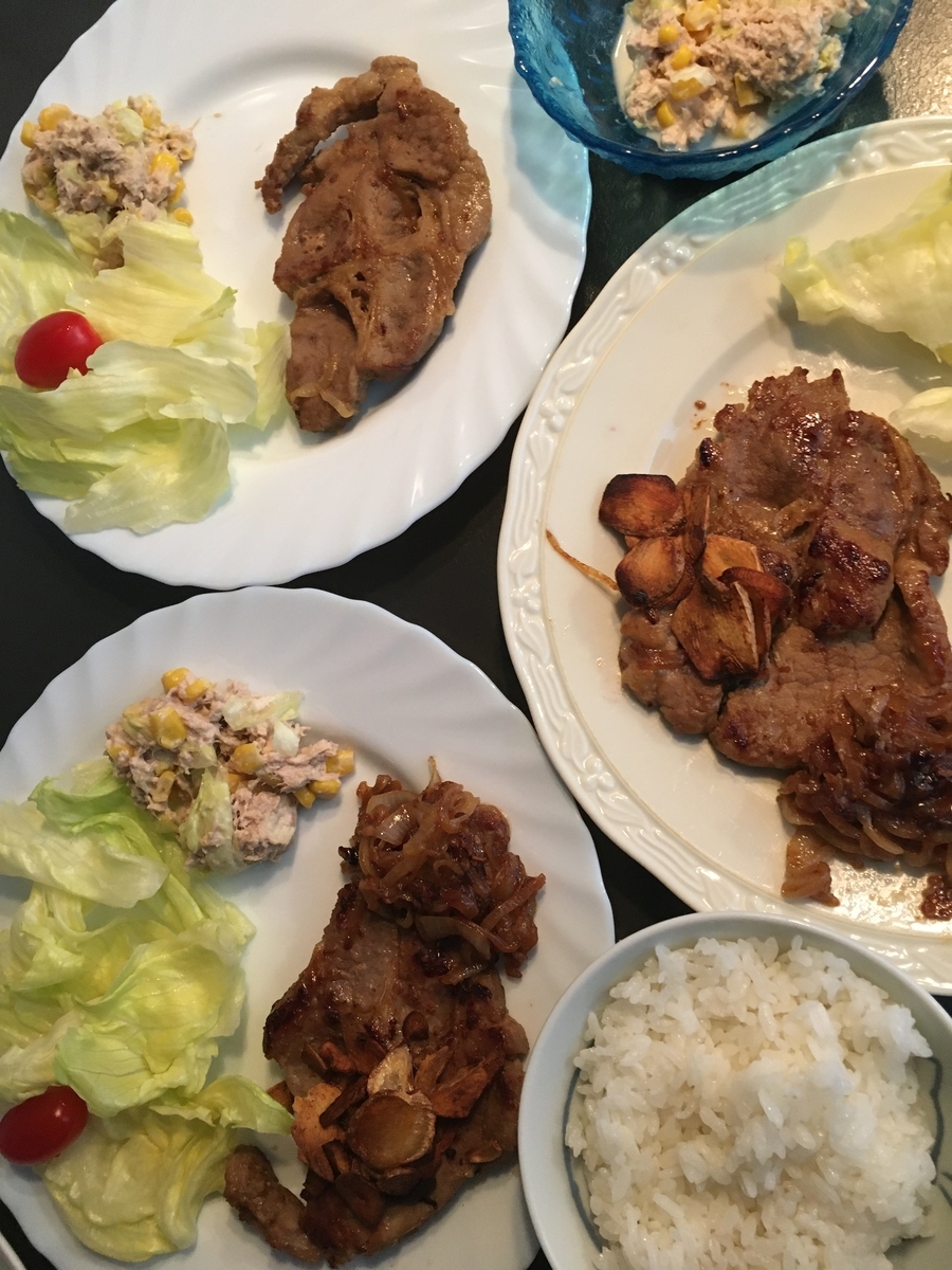 豚ステーキ、玉ねぎソース、ニンニクチップ、ツナサラダ、レタス、トマト