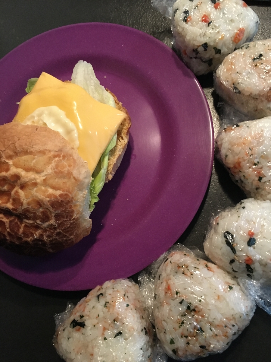 朝:ハンバーガー、おにぎり