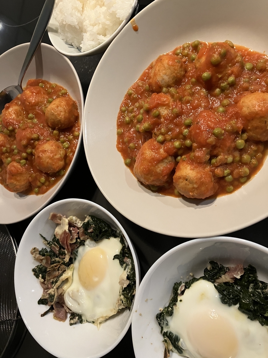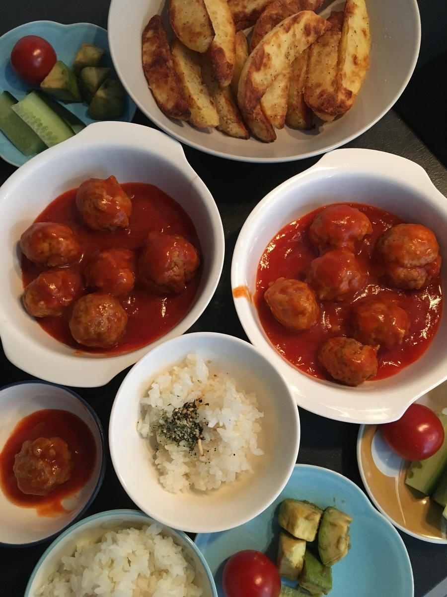 夜:ミートボール、ポテトフライ、アボカド、