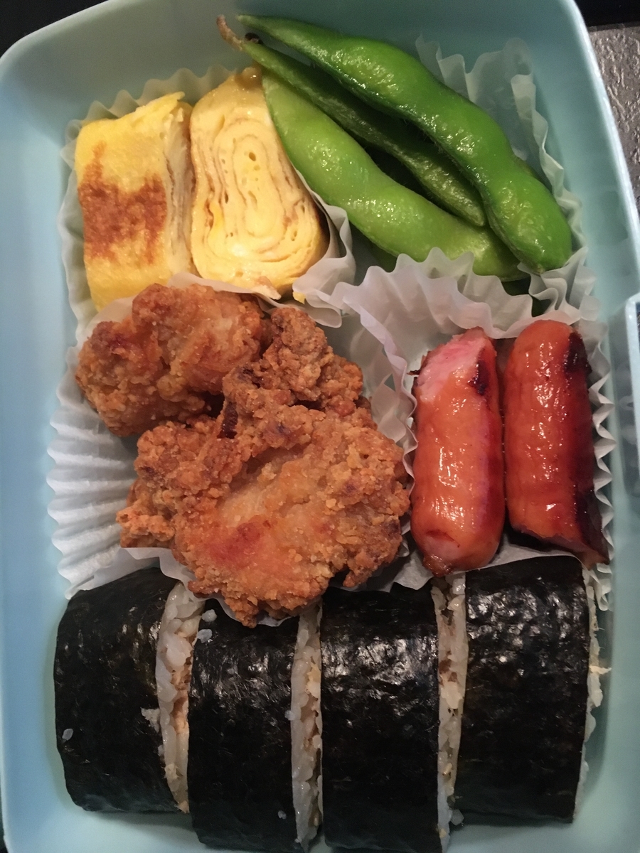 夜:太巻き寿司(ツナ、レタス)、やきとり、みそ汁、サラダ