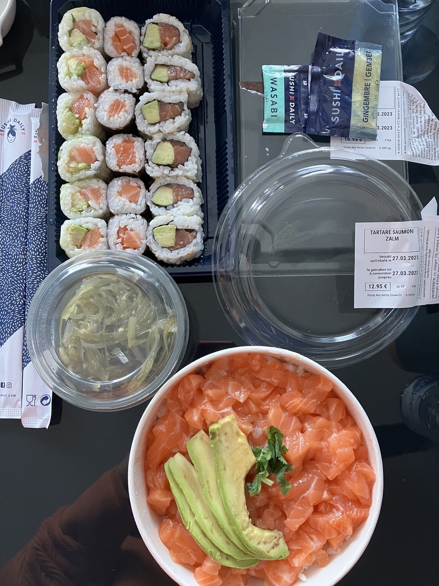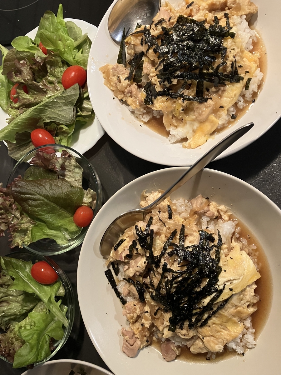 サーモンアボカド丼、みそ汁、焼うどん