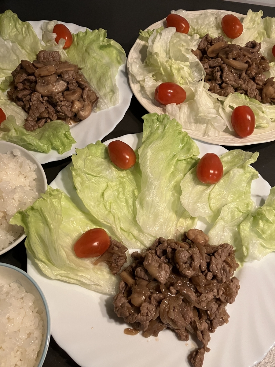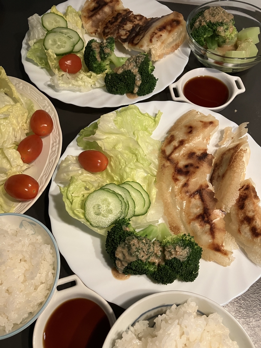 餃子、ポン酢、インゲン牛肉炒め、サラダ