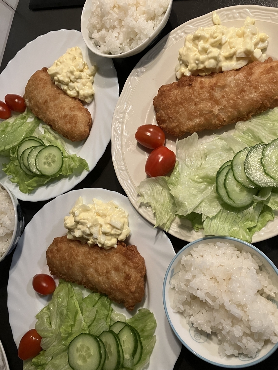 夜:魚フライ、タルタルソース、プルコギ、サラダ